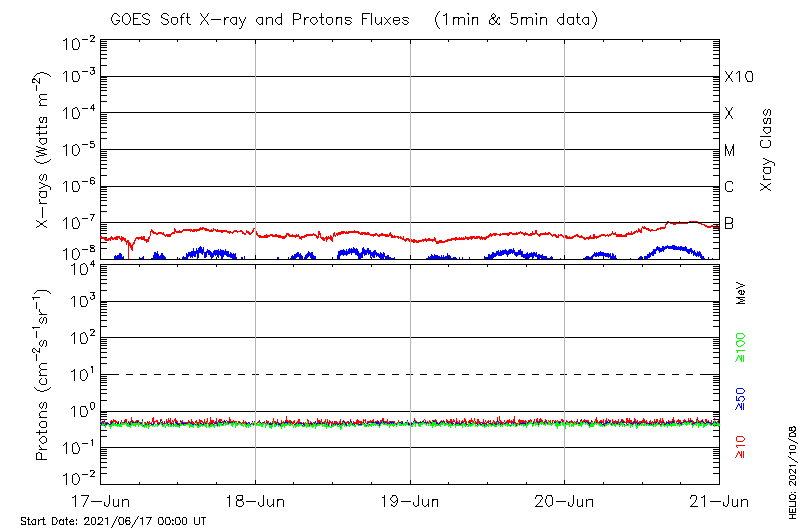 This page provides light-curves generated from GOES soft X-ray and Particle data for the date indicated at the top and the preceding three days.
