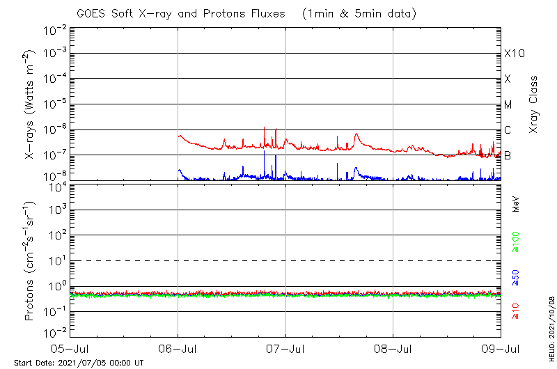 This page provides light-curves generated from GOES soft X-ray and Particle data for the date indicated at the top and the preceding three days.