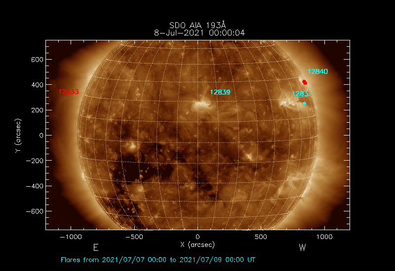 Click on an Active Region plot to display the Region Report including the region evolution and flaring history. HEC Search for NOAA Active Regions (SRS) records for this date and the day before.