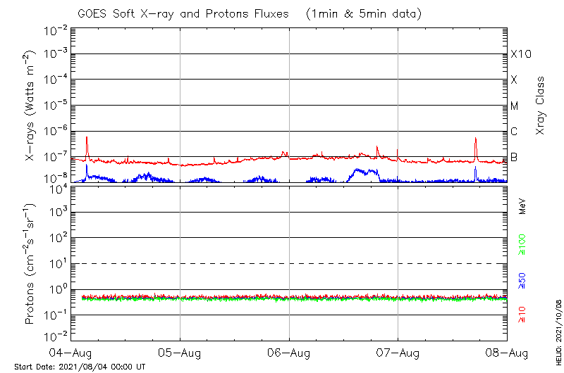 This page provides light-curves generated from GOES soft X-ray and Particle data for the date indicated at the top and the preceding three days.