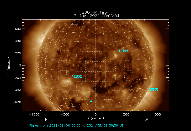 Click on an Active Region plot to display the Region Report including the region evolution and flaring history. HEC Search for NOAA Active Regions (SRS) records for this date and the day before.