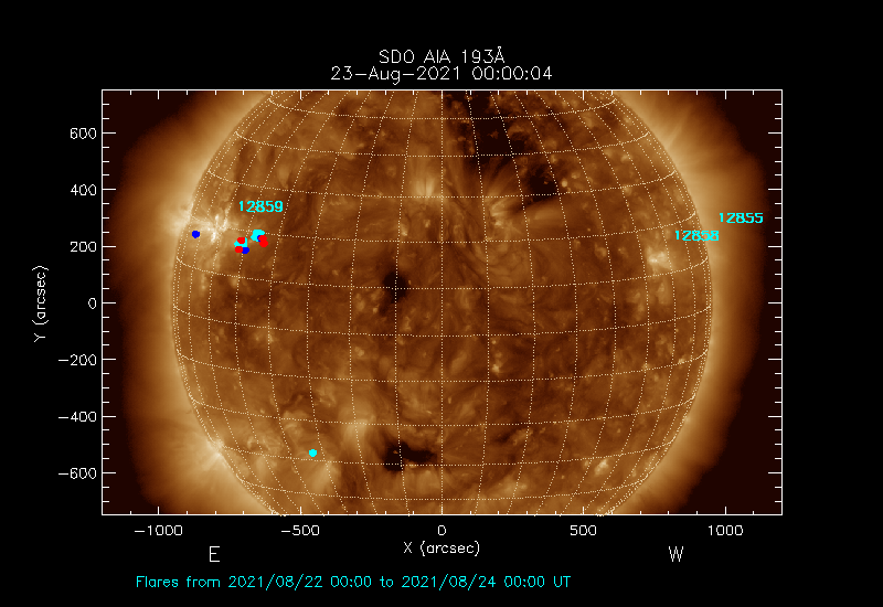 The most recent flares (≤12 hours) are shown as red dots, 12-24 hours ago as blue dots and older ones as turquoise dots.
