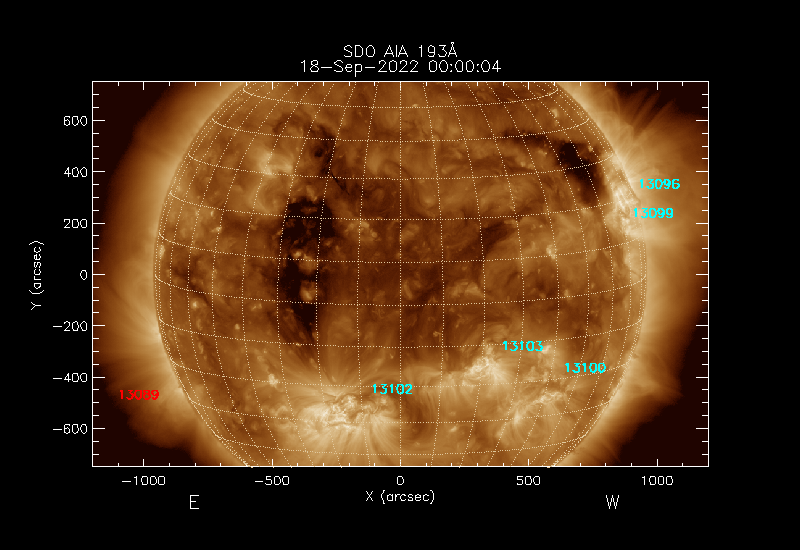 Click on an Active Region plot to display the Region Report including the region evolution and flaring history. HEC Search for NOAA Active Regions (SRS) records for this date and the day before.