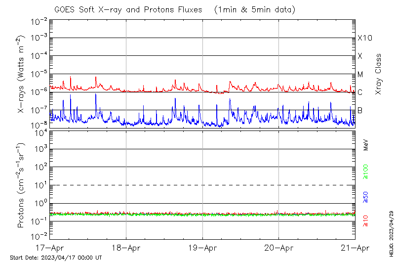 This page provides light-curves generated from GOES soft X-ray and Particle data for the date indicated at the top and the preceding three days.