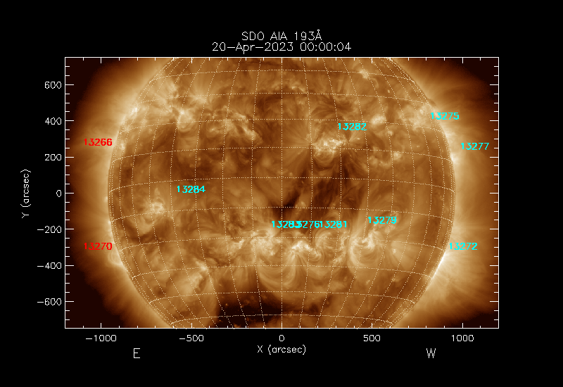 Click on an Active Region plot to display the Region Report including the region evolution and flaring history. HEC Search for NOAA Active Regions (SRS) records for this date and the day before.