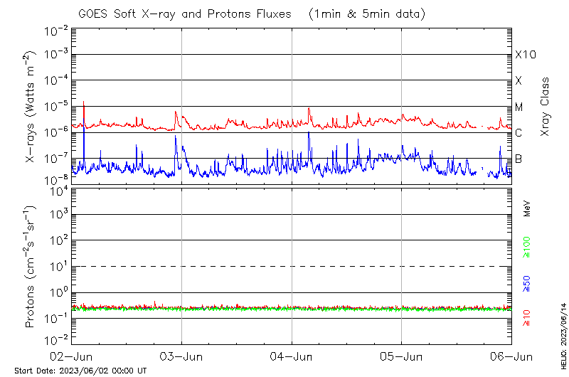 This page provides light-curves generated from GOES soft X-ray and Particle data for the date indicated at the top and the preceding three days.