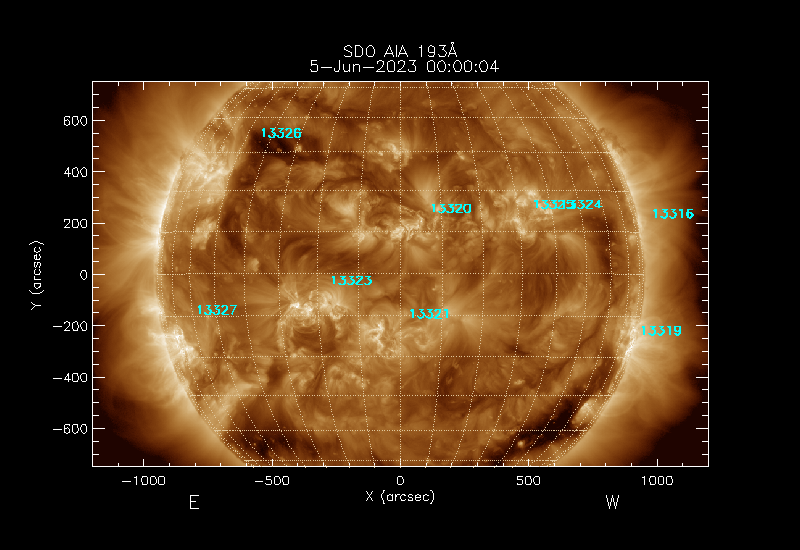 Click on an Active Region plot to display the Region Report including the region evolution and flaring history. HEC Search for NOAA Active Regions (SRS) records for this date and the day before.