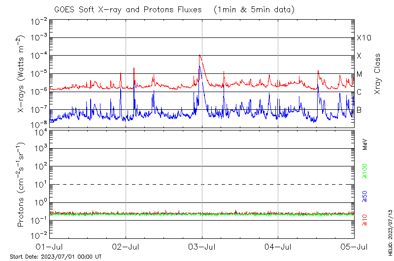 This page provides light-curves generated from GOES soft X-ray and Particle data for the date indicated at the top and the preceding three days.