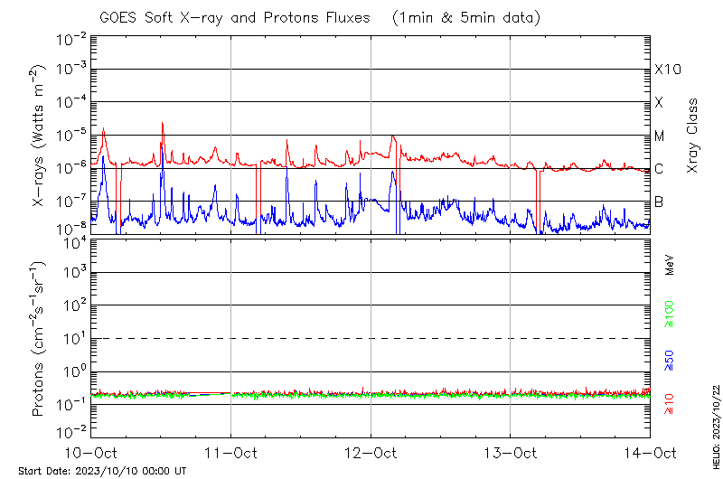 This page provides light-curves generated from GOES soft X-ray and Particle data for the date indicated at the top and the preceding three days.