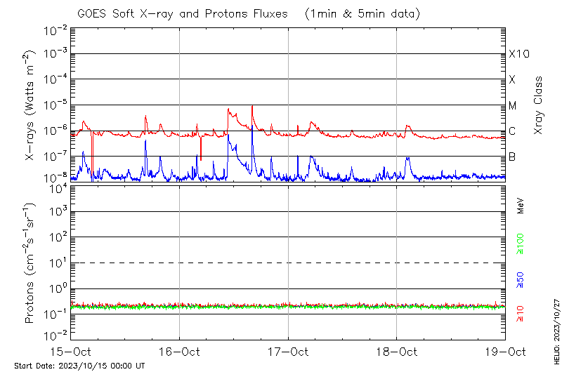 This page provides light-curves generated from GOES soft X-ray and Particle data for the date indicated at the top and the preceding three days.