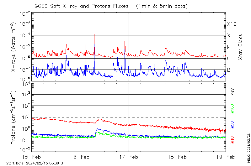 This page provides light-curves generated from GOES soft X-ray and Particle data for the date indicated at the top and the preceding three days.