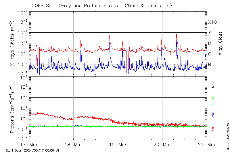This page provides light-curves generated from GOES soft X-ray and Particle data for the date indicated at the top and the preceding three days.