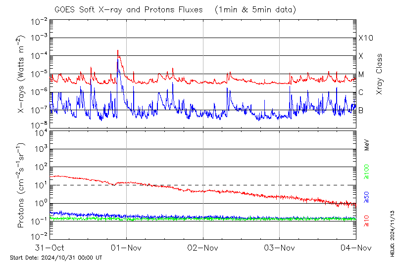 This page provides light-curves generated from GOES soft X-ray and Particle data for the date indicated at the top and the preceding three days.