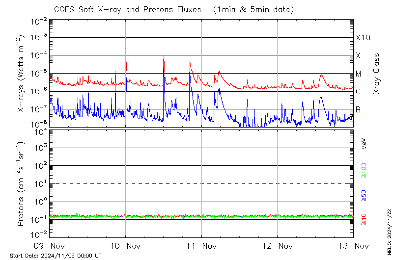 This page provides light-curves generated from GOES soft X-ray and Particle data for the date indicated at the top and the preceding three days.