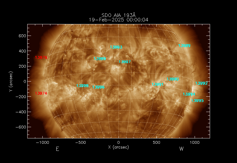 Click on an Active Region plot to display the Region Report including the region evolution and flaring history. HEC Search for NOAA Active Regions (SRS) records for this date and the day before.