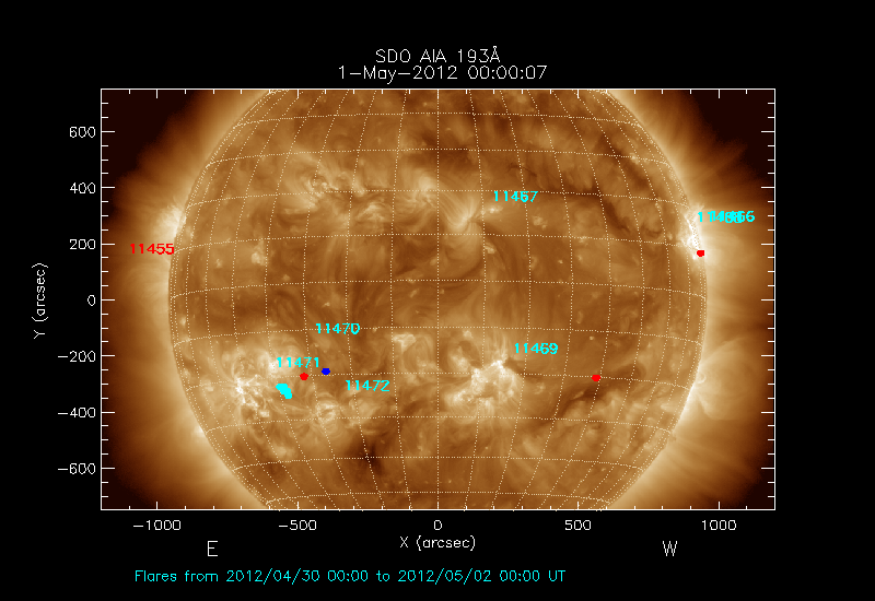 The most recent flares (≤12 hours) are shown as red dots, 12-24 hours ago as blue dots and older ones as turquoise dots.