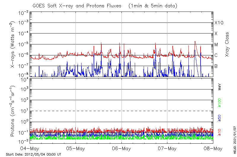This page provides light-curves generated from GOES soft X-ray and Particle data for the date indicated at the top and the preceding three days.