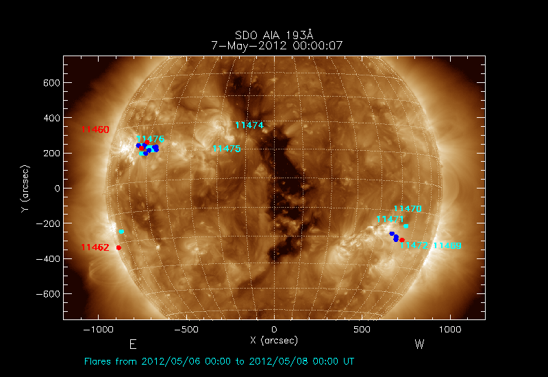 dots and 24-48 hours as turquoise dots; the flare locations are rotated to the time of the image.