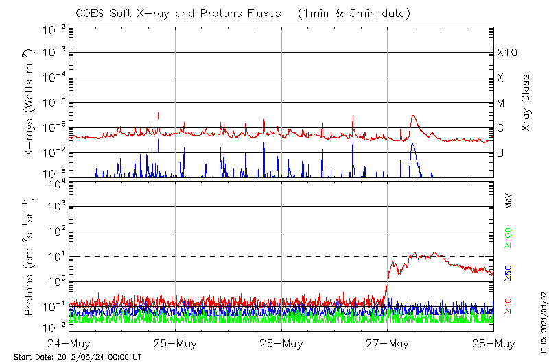 This page provides light-curves generated from GOES soft X-ray and Particle data for the date indicated at the top and the preceding three days.