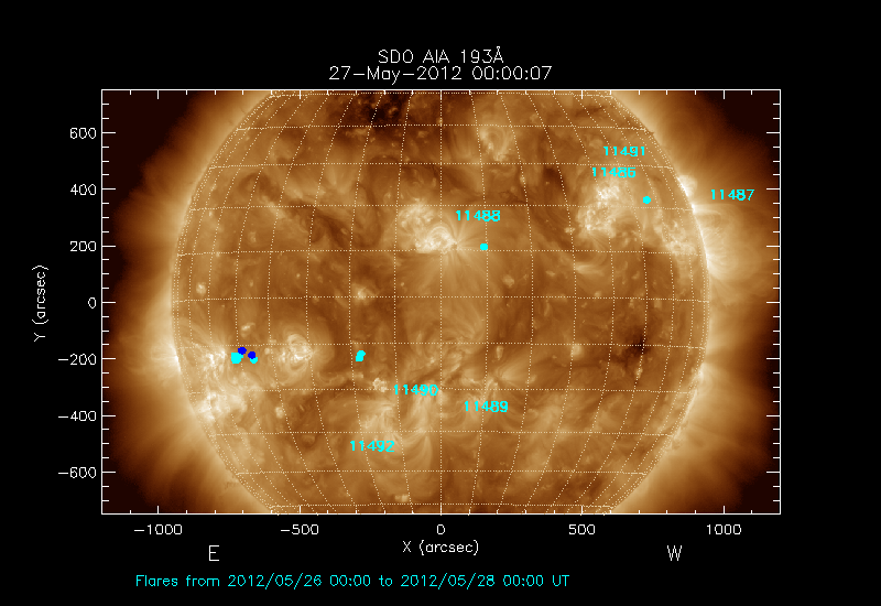 shows the locations soft X-ray flares that occurred within