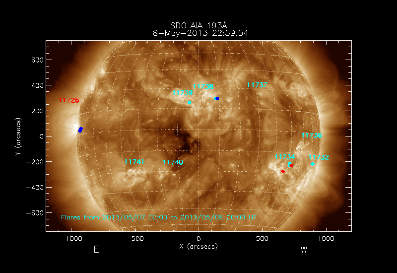 The locations of the flares over-plotted on the image are derived from the flare catalogue