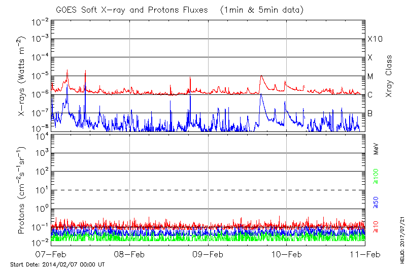 This page provides light-curves generated from GOES soft X-ray and Particle data for the date indicated at the top and the preceding three days.