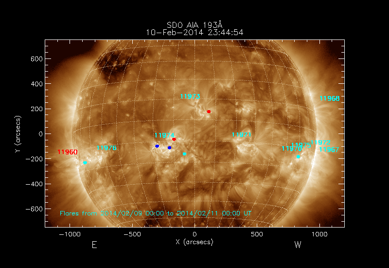 All soft X-ray flares (≥A1.0) where the location has been determined are shown; the flare locations are rotated to the time of the image