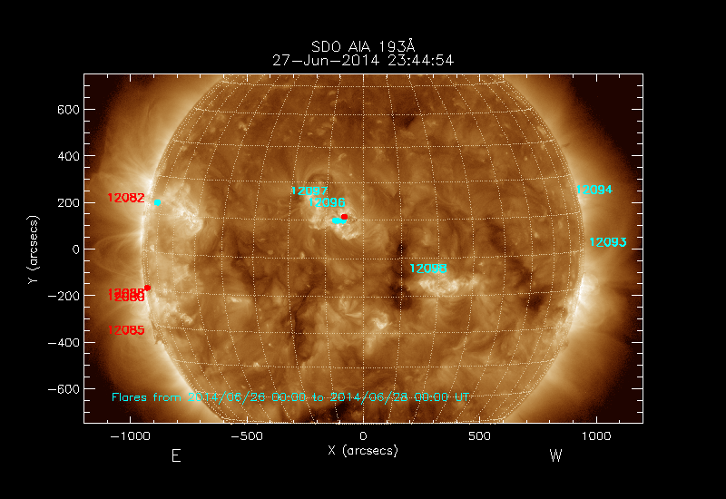 The Flare Locations page shows the locations soft X-ray flares that occurred within a 48 hour intervals (ending at the end of the date shown at the top of the page) over-plotted on a context image. The image used is normally SDO AIA 193Å but PROBA2 SWAP 194Å images are used if no SDO data are available.