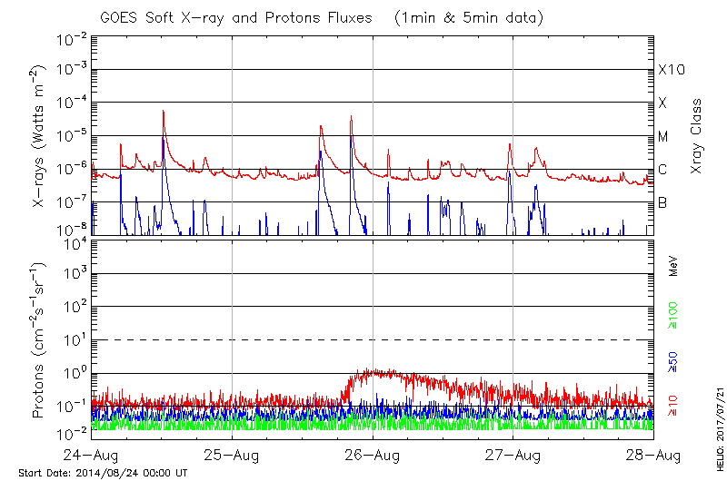 This page provides light-curves generated from GOES soft X-ray and Particle data for the date indicated at the top and the preceding three days.