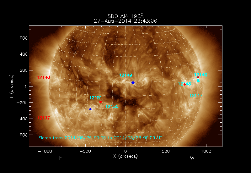 The most recent flares (≤12 hours) are shown as red dots, 12-24 hours ago as blue dots and older ones as turquoise dots.