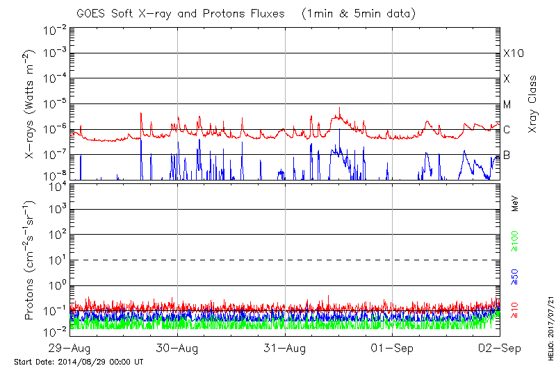 This page provides light-curves generated from GOES soft X-ray and Particle data for the date indicated at the top and the preceding three days.