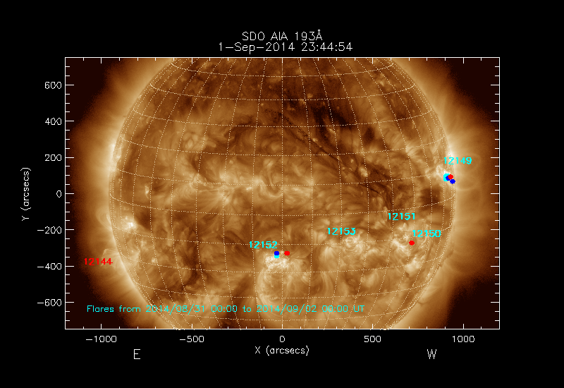 All soft X-ray flares (≥A1.0) where the location has been determined are shown; the flare locations are rotated to the time of the image