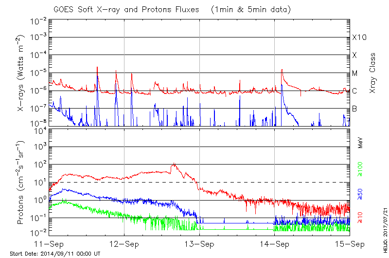 This page provides light-curves generated from GOES soft X-ray and Particle data for the date indicated at the top and the preceding three days.