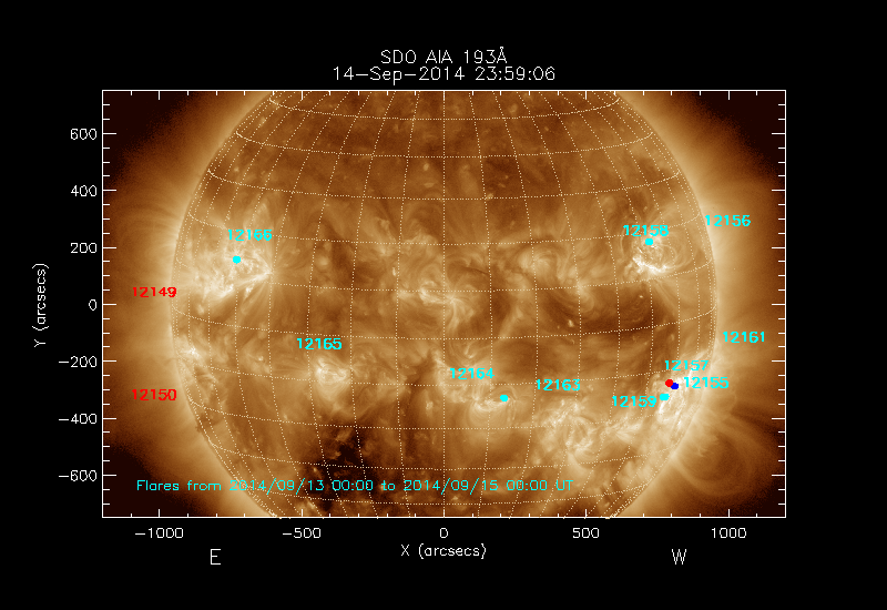 shows the locations soft X-ray flares that occurred within