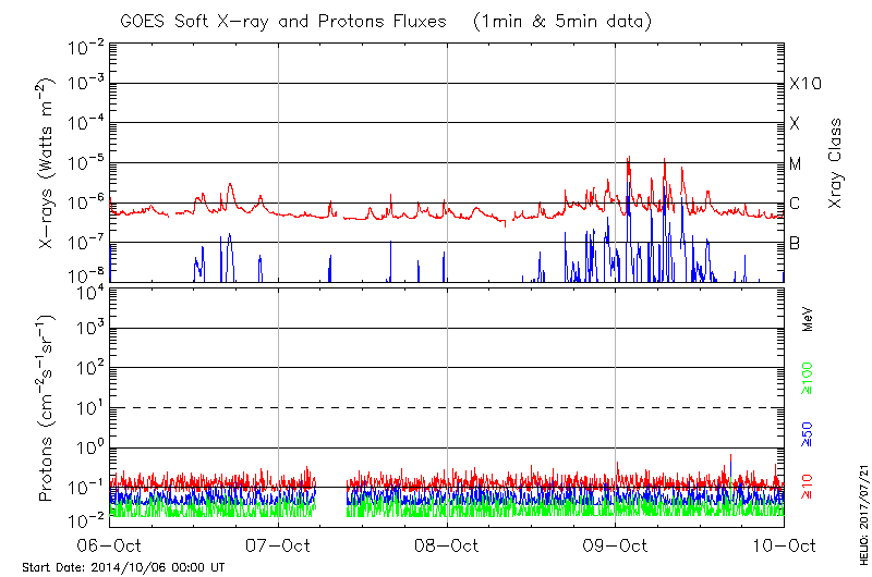 This page provides light-curves generated from GOES soft X-ray and Particle data for the date indicated at the top and the preceding three days.