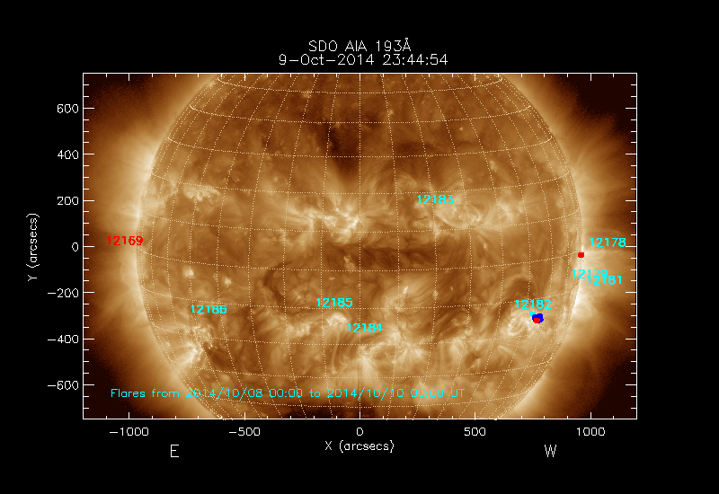 All soft X-ray flares (≥A1.0) where the location has been determined are shown; the flare locations are rotated to the time of the image