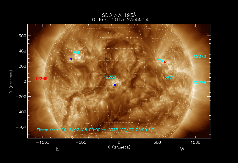 The most recent flares (≤12 hours) are shown as red dots, 12-24 hours ago as blue dots and older ones as turquoise dots.