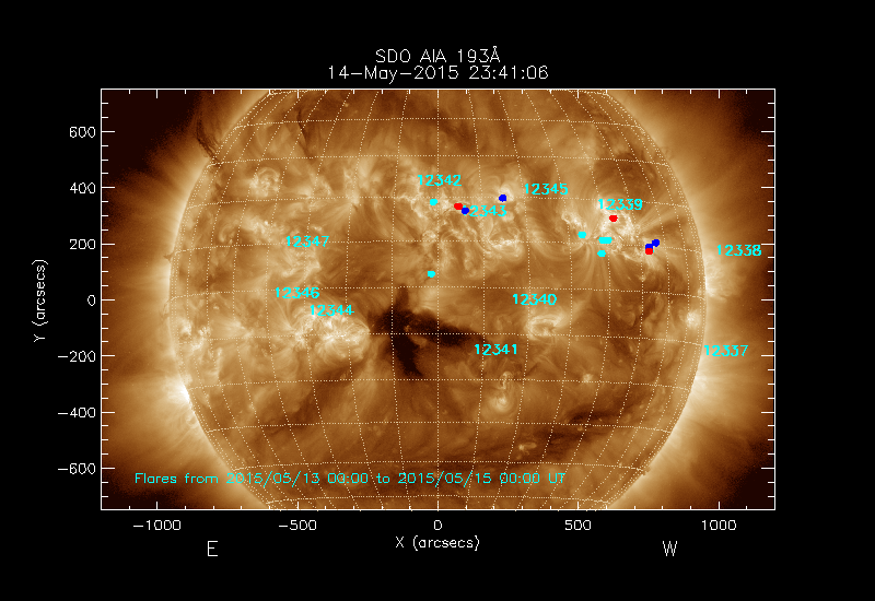 The most recent flares (≤12 hours) are shown as red dots, 12-24 hours ago as blue dots and older ones as turquoise dots.