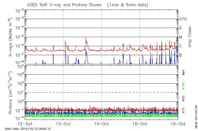 This page provides light-curves generated from GOES soft X-ray and Particle data for the date indicated at the top and the preceding three days.