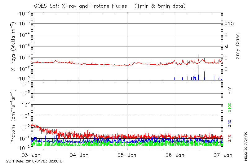 This page provides light-curves generated from GOES soft X-ray and Particle data for the date indicated at the top and the preceding three days.