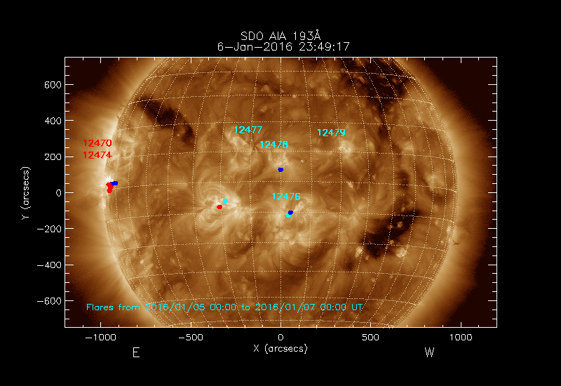 All soft X-ray flares (≥A1.0) where the location has been determined are shown; the flare locations are rotated to the time of the image