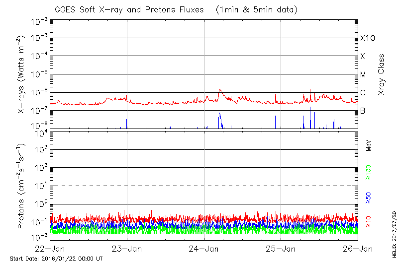 This page provides light-curves generated from GOES soft X-ray and Particle data for the date indicated at the top and the preceding three days. The designated date is the right most panel; the locations shown on the Flare Locations page are covered in the two right hand panels.