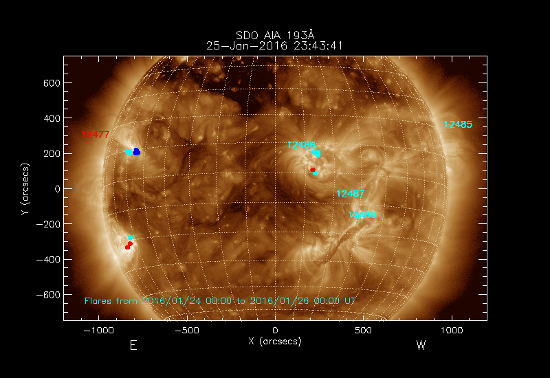 All soft X-ray flares (≥A1.0) where the location has been determined are shown; the flare locations are rotated to the time of the image and the page indicated by the known positions link shows the flares that have been included. The most recent flares (≤12 hours) are shown as red dots, 12-24 hours ago as blue dots and older ones as turquoise dots.