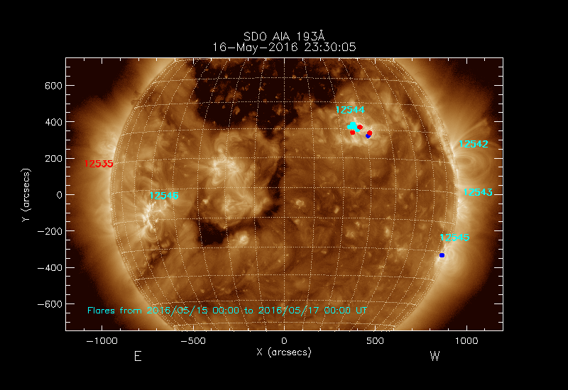 The most recent flares (≤12 hours) are shown as red dots, 12-24 hours ago as blue dots and older ones as turquoise dots.