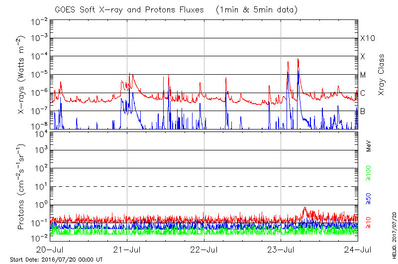 This page provides light-curves generated from GOES soft X-ray and Particle data for the date indicated at the top and the preceding three days.