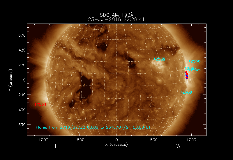 Click on an Active Region plot to display the Region Report including the region evolution and flaring history. HEC Search for NOAA Active Regions (SRS) records for this date and the day before.