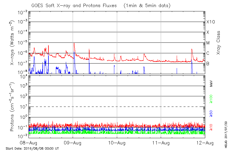 This page provides light-curves generated from GOES soft X-ray and Particle data for the date indicated at the top and the preceding three days.