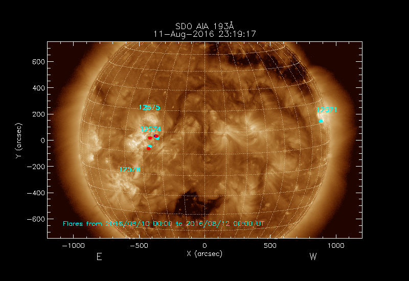 The most recent flares (≤12 hours) are shown as red dots, 12-24 hours as blue