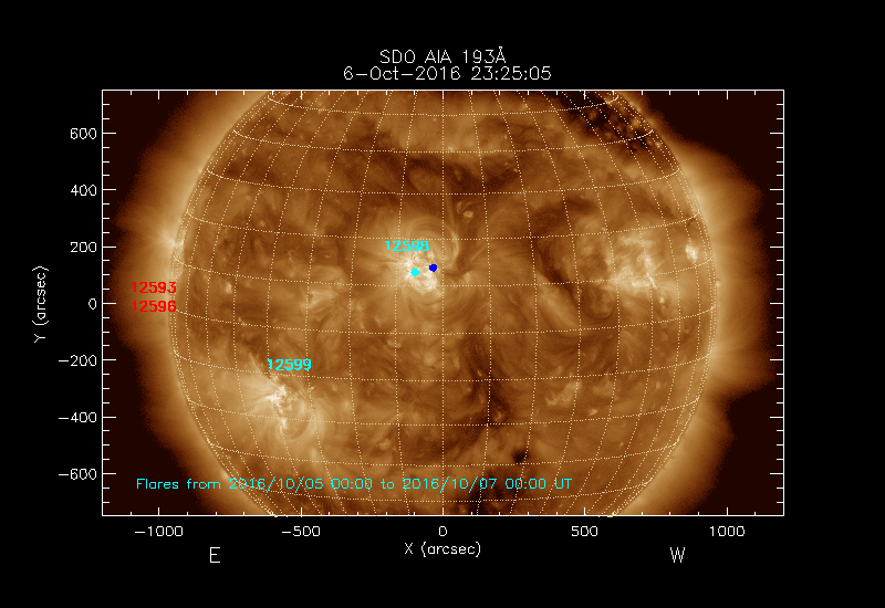 The most recent flares (≤12 hours) are shown as red dots, 12-24 hours ago as blue dots and older ones as turquoise dots.