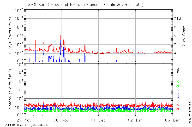 This page provides light-curves generated from GOES soft X-ray and Particle data for the date indicated at the top and the preceding three days.